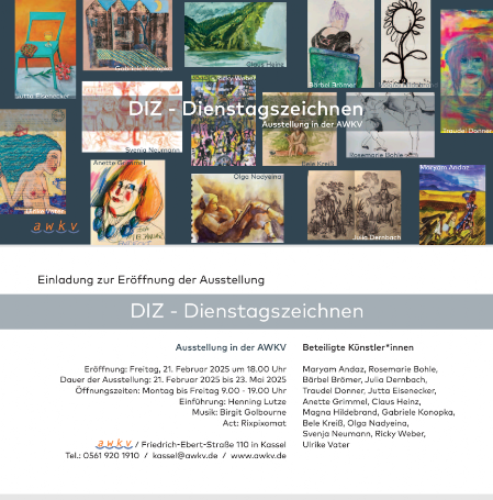 Ich bin mit 8 Arbeiten an der Gruppenausstellung vom diz (Dienstagszeichnen) im AWKV (Friedrich-Ebert-Str. 110 in Kassel) beteiligt.