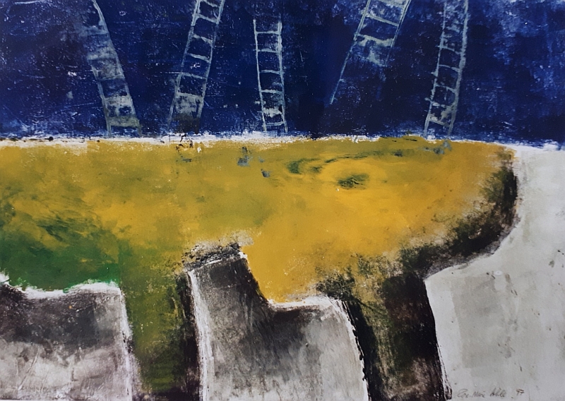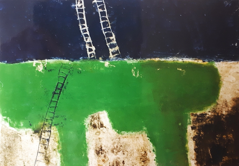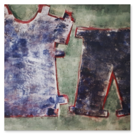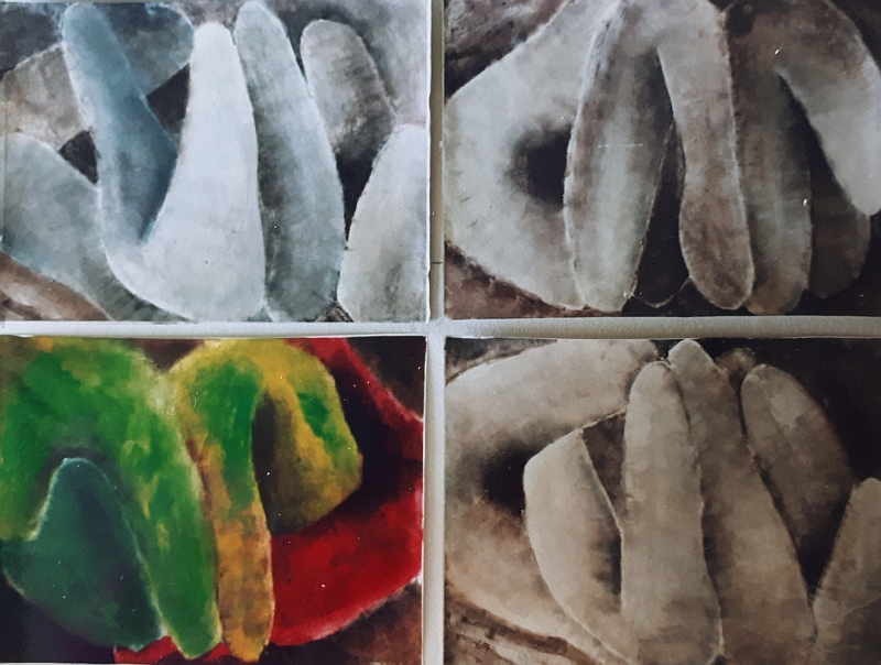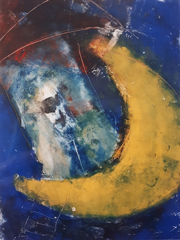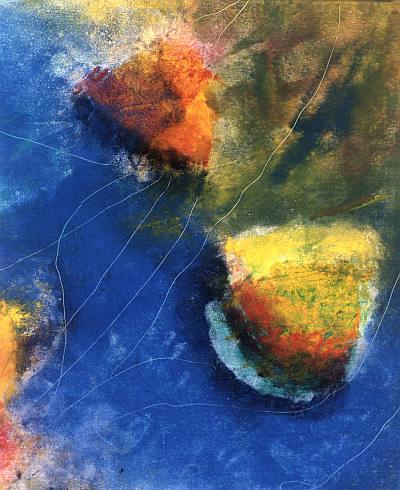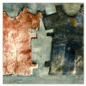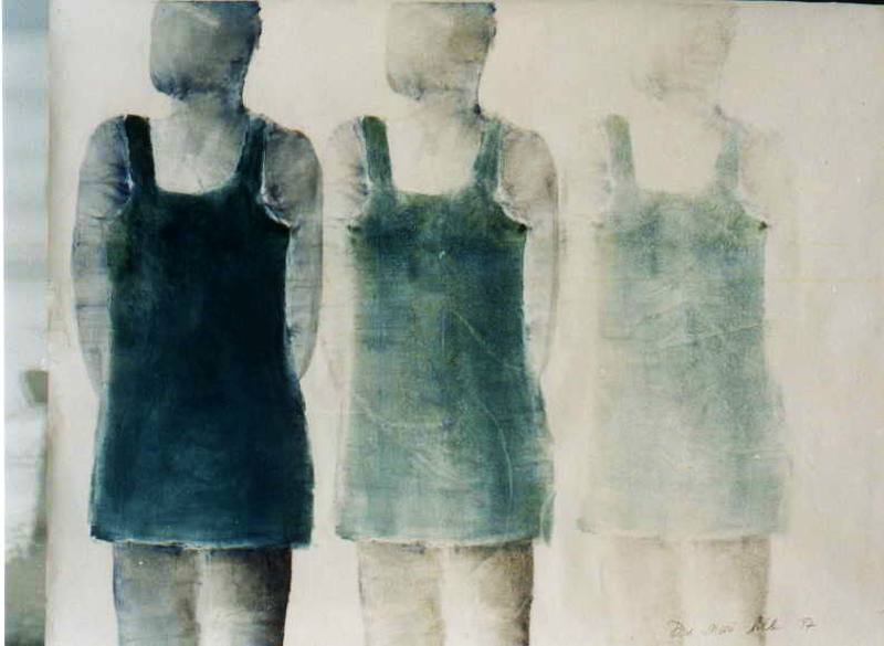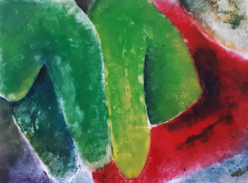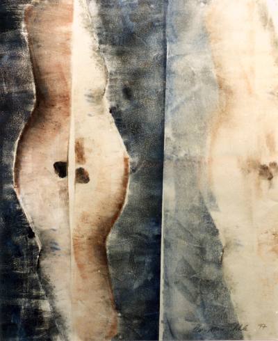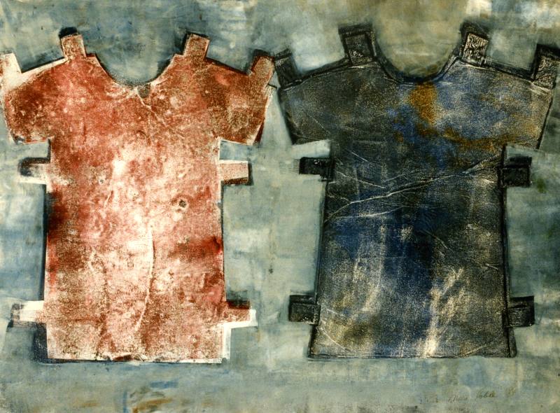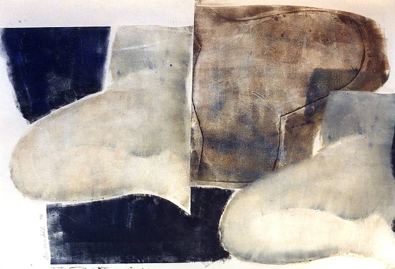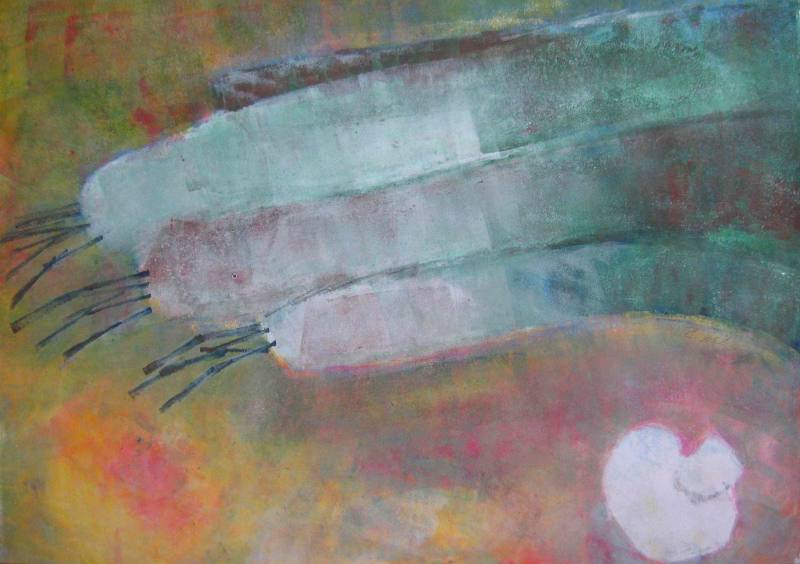 Monotypien sind Einmaldrucke. Farbe wird auf eine Glasplatte aufgetragen und mit Papier "abgenommen". Reste von Farben eines Bildes können in das nächste Bild hinein genommen werden. Mich fasziniert das Ergebnis, denn neben der Seitenverkehrung sind auch immer Spuren früherer Farbaufträge zu sehen. Bilder können so einen freskenhaften Charakter bekommen. Hier eine Auswahl aus verschiedenen Serien - Weiberleiber, Nährstücke, Leitervariationen, Hemden, Abstraktionen.