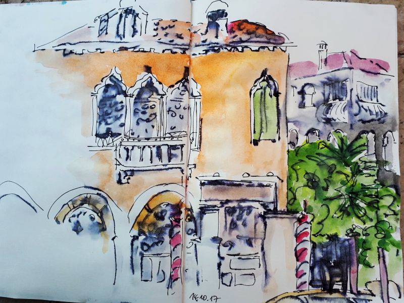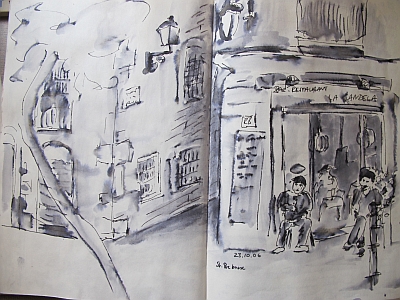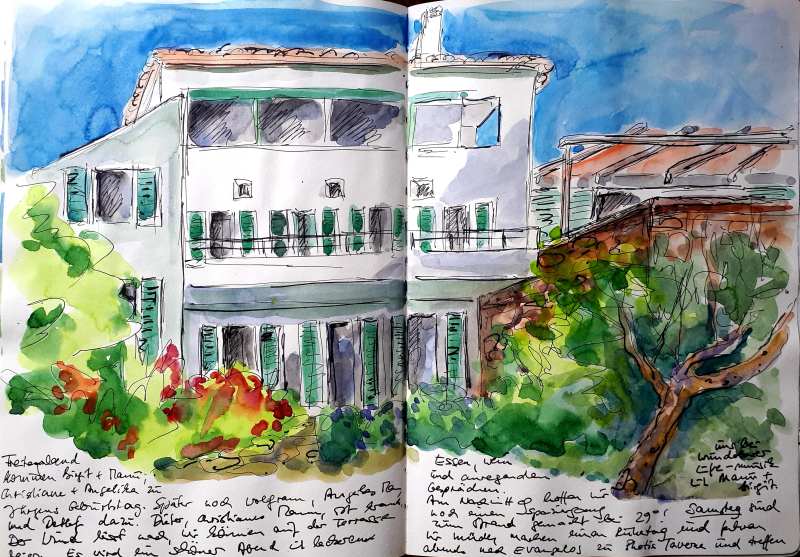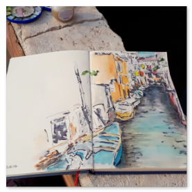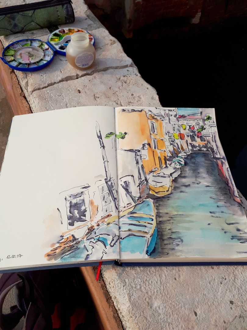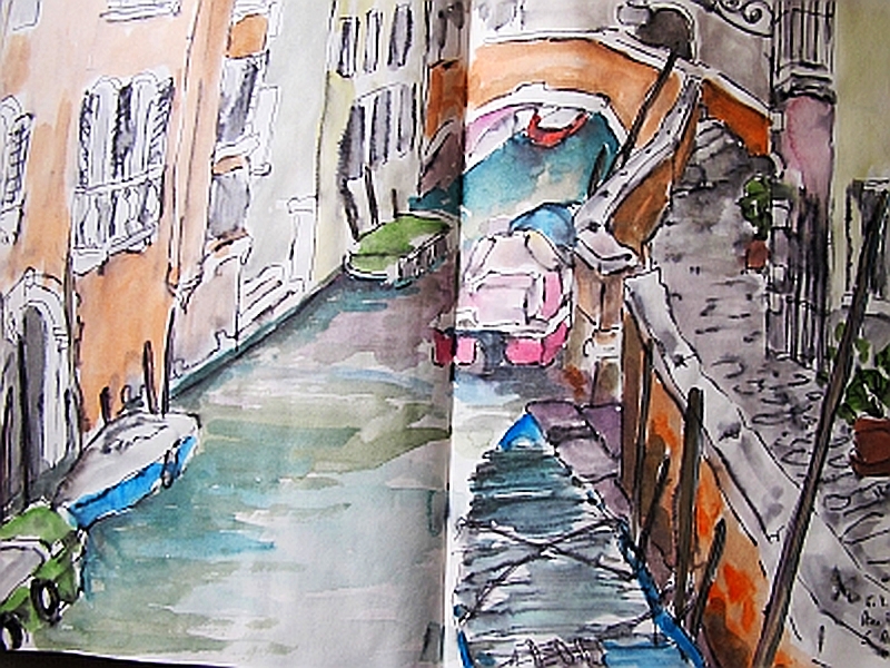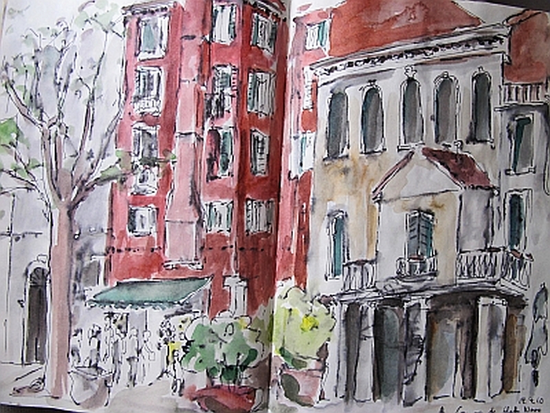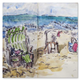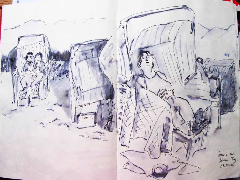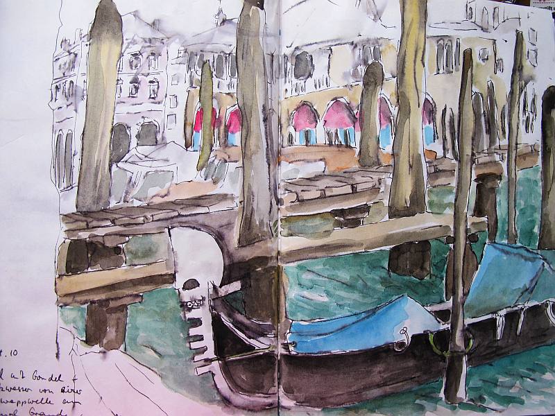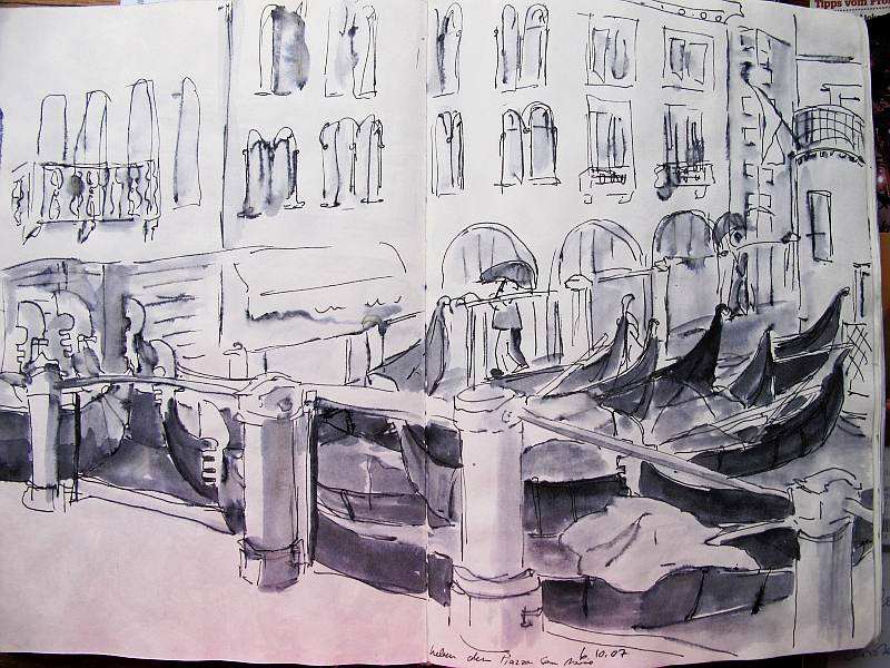 Viele meiner Skizzen sind auf Reisen entstanden: in verschiedenen Städten wie Venedig, Barcelona, Florenz, Athen, in Frankreich, in Griechenland, am Lago Maggiore, am Gardasee, an der Nordsee, an der Ostsee. Es sind intensive Erinnerungen an die Situationen, in denen ich dasaß und die Eindrücke im Skizzenbuch festhielt. Hier eine kleine Auswahl: