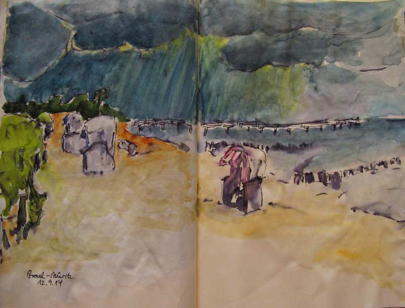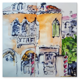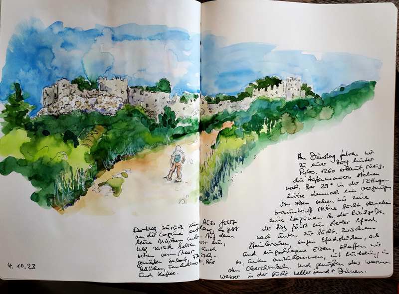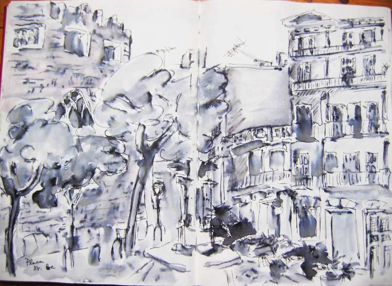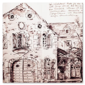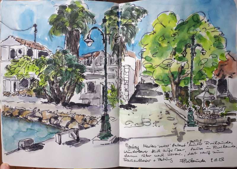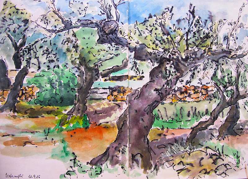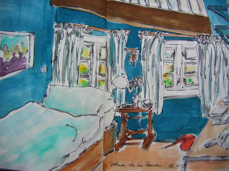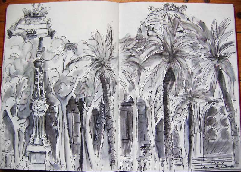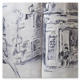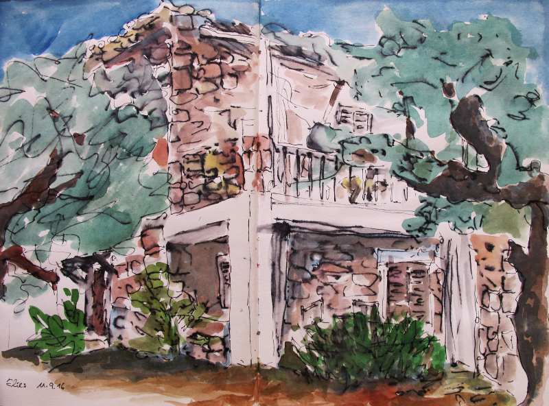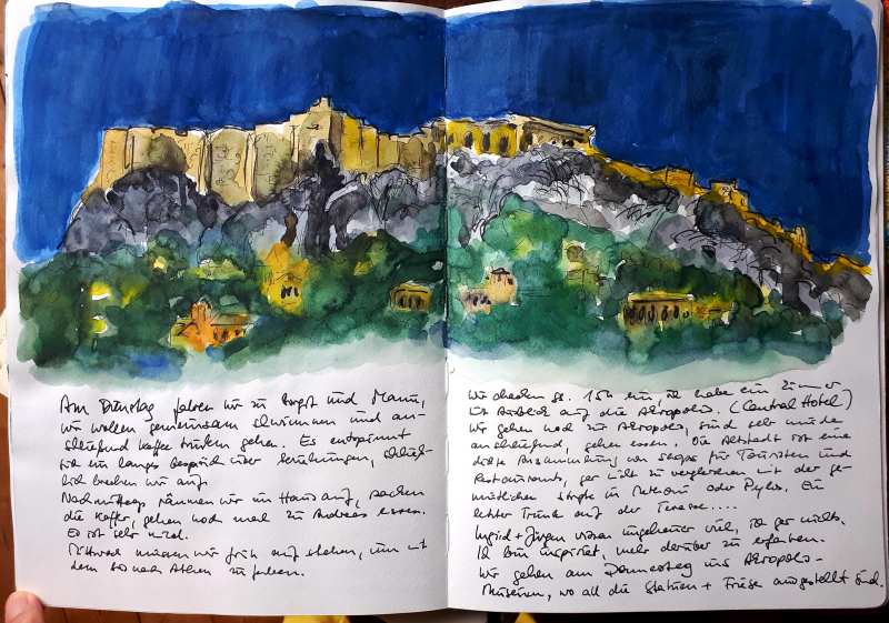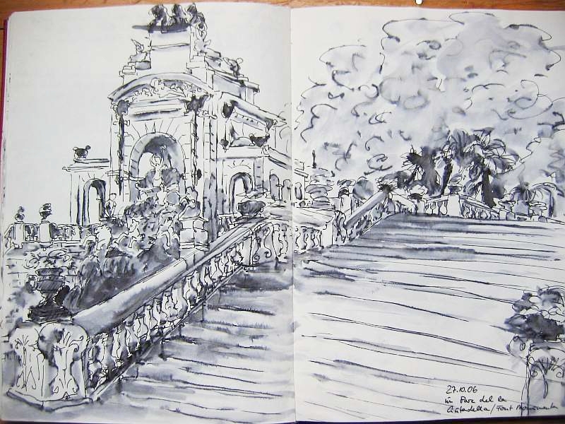 Viele meiner Skizzen sind auf Reisen entstanden: in verschiedenen Städten wie Venedig, Barcelona, Florenz, Athen, in Frankreich, in Griechenland, am Lago Maggiore, am Gardasee, an der Nordsee, an der Ostsee. Es sind intensive Erinnerungen an die Situationen, in denen ich dasaß und die Eindrücke im Skizzenbuch festhielt. Hier eine kleine Auswahl: